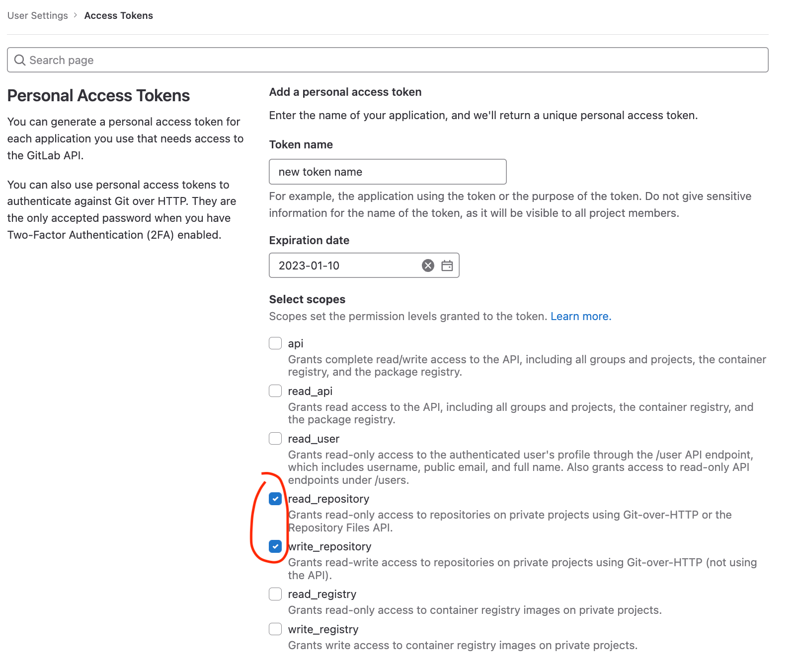 - Give your access token a name and select a scope for it. In most cases, the default scope (api) will suffice. You can also set an expiration date for the token if desired. But, if you want to be specific you can choose